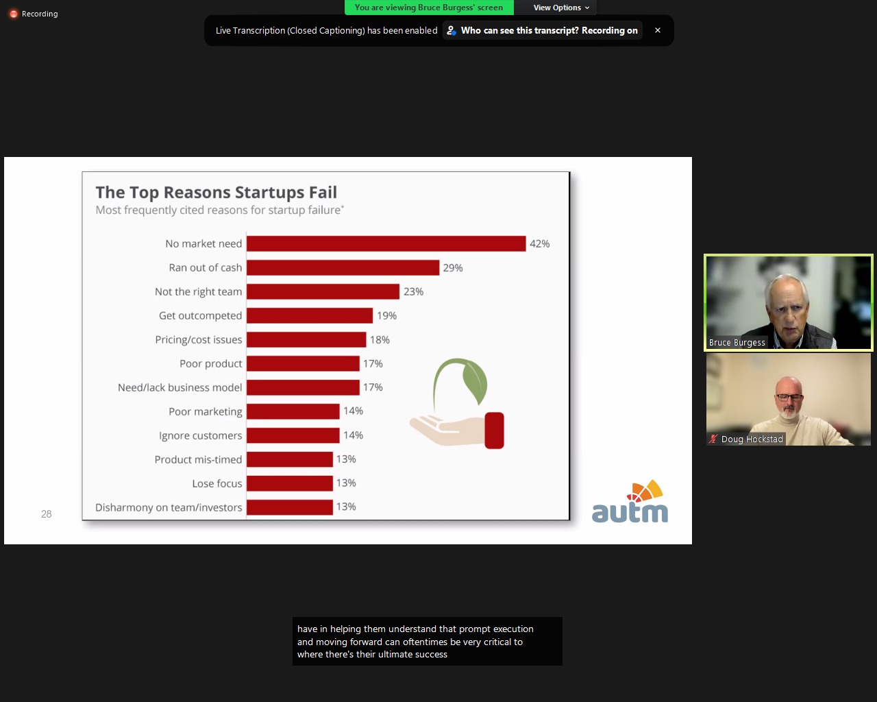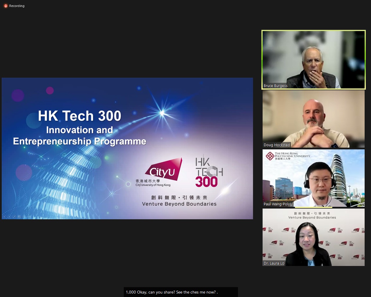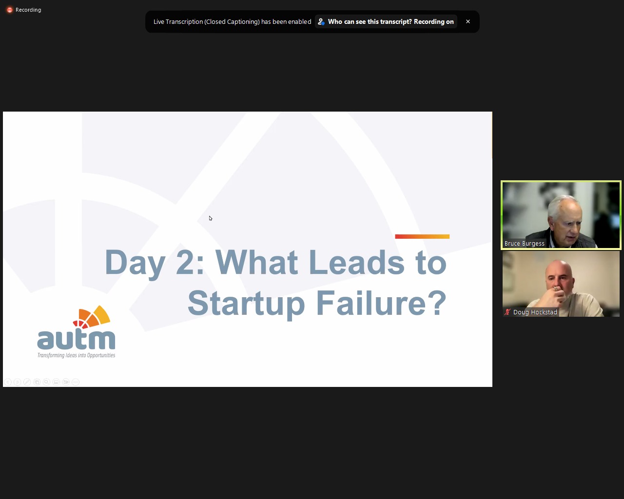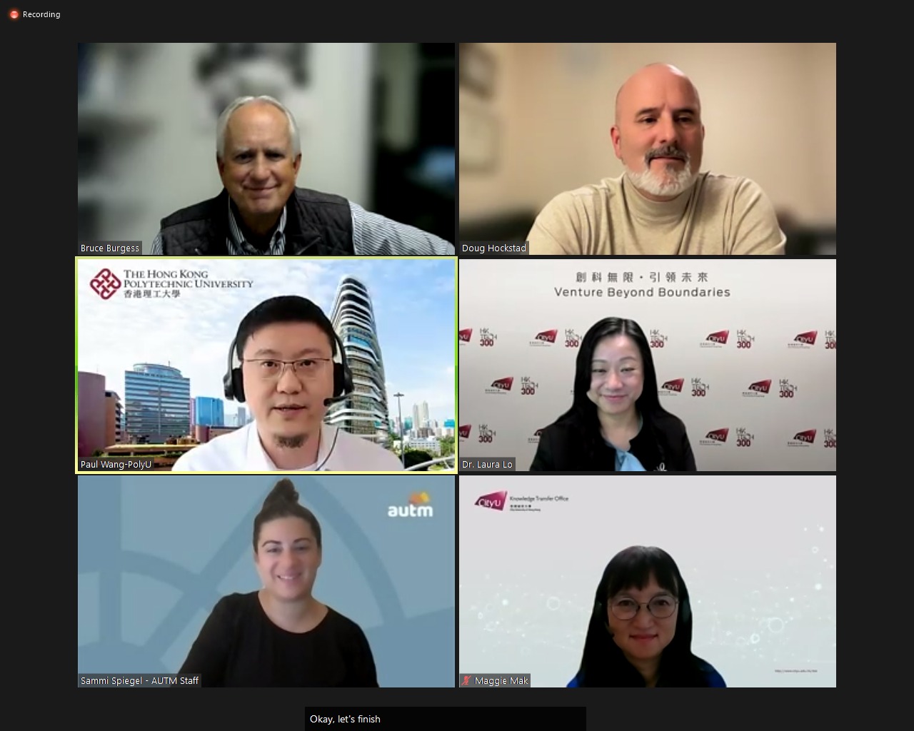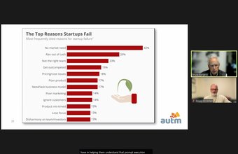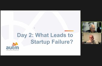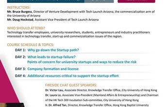 "What leads to startup failure?" was the topic for the second class of the "AUTM Virtual Course in HK" held today. US instructors Doug and Bruce shared startup programmes in Arizona/US and guest speaker Dr. Laura Lo from CityU shared information of their flagship startup programme HK Tech 300 with audience. Many of these programmes aim to support entrepreneurs from early stage onward and extend their business networks so as to minimize their risk of failure.