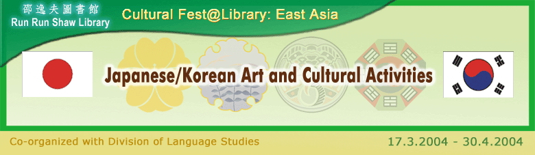Cultural Fest@Library: East Asia The Cultural Fest@Library is one of new initiatives of the Library to promote cultural understanding among students and to provide opportunities for students to enhance their whole person development. From mid-March to end-April 2004, a series of Japanese and Korean cultural activities are organized in collaboration with the Division of Language Studies: