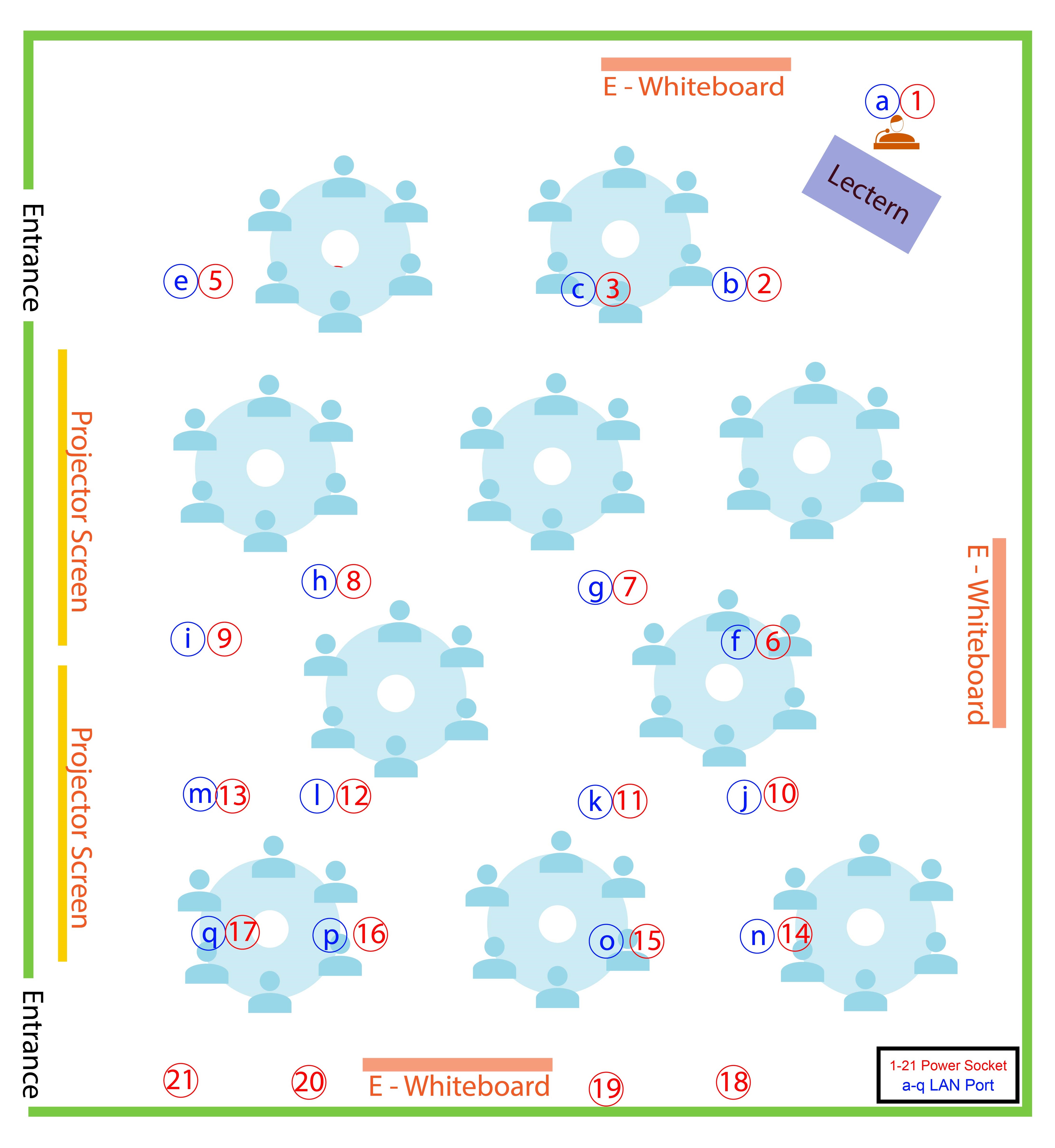 - Users are responsible for any damages of the furniture and equipment in the rooms.