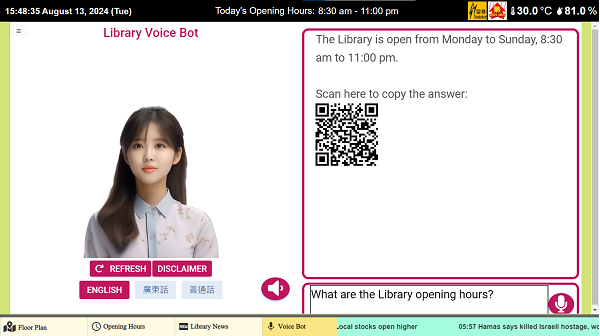 A virtual help desk is set up at the Circulation Counter. After pressing the Start button, library staff will meet with you live and answer your questions about the library’s collections, services, and so forth. The service is available Monday – Friday, 9:00 am – 5:00 pm (except public holidays).