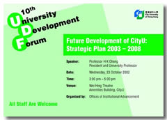 Professor Chang said the issue can be resolved in three steps: first, to define Hong Kong's new position in the overall context of China's rapid emergence as a global economic powerhouse; second, to determine how best CityU can contribute to Hong Kong's new role; and last, to come up with a new strategic plan that can help the University achieve its vision and mission.