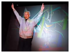 Technically, capturing body motion and gesture to allow the computer to "see" them involved developing a camera system to capture the image and input it to the computer. "And that took a bit of research," Professor Ip said, "because you want a lighting system that doesn't interfere with human motion." There are devices that capture motion but they require special clothing or sensors, which would interfere with the artist's movements. "We wanted something completely free, where the type of clothing didn't matter, so we came up with an infrared lighting system and infrared sensitive cameras."
