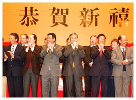 The party started with a lion dance performance by the Liang Youquan Martial Art Club. After the eye-dotting and the "get-the-green" ceremony, Professor Chang hit a bronze gong and couplets hanging on both sides of the backdrop scrolled down. Accompanied by the Vice-Presidents, department heads and four "Gods of Fortune" (Mr Desmond O'Toole, Dr Ho To-ming, Professor Lee Chin-chuan and Mr Eric Chang), Professor Chang gave Chinese new year wishes and distributed lai see (lucky red packets) to