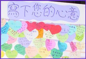 "I'm very impressed to see a group of young people taking the initiative in organizing this event. We really need such an occasion to express our heartfelt thanks to the people who have helped to fight against SARS during the past month," said Ms Li, a passer-by who jotted down "Never Give Up" on a greeting card.