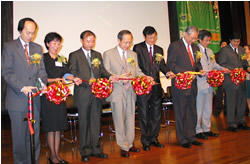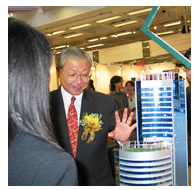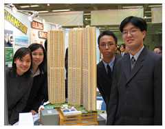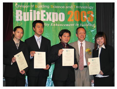 Organized around the theme of "Quality Enhancement in Building," Built Expo 2003 marked the 10th anniversary of the annual final-year student project competition and exhibition launched in 1994. "Over time and through experience and practice, the Built Expo has become an integral element and a core function of the Division's commitment to experiential and practical learning," said Mrs Julie Mo, Head of the Division, at the opening ceremony. Joining Mrs Mo for the ribbon-cutting were Vice-President (Academic Affairs) Professor David Tong, Vice-President (Undergraduate Education) Professor Edmond Ko, Secretary for Housing, Planning and Lands Mr Michael Suen, and representatives of the panel of judges: Director of AGC Design Ltd Mr Tony Lam, Director of Wong and Ouyang (Building Services) Ltd Mr Michael Tang, Managing Director of Professional Engineering Ltd Dr Alex Cheung, and Junior Vice-President of the Hong Kong Institute of Surveyors Mr T T Cheung.