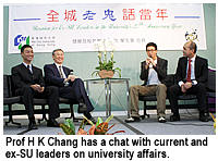 To celebrate the 20th anniversary of the University, the Development and Alumni Relations Office (DAO) and the Students’ Union co-organized the Reunion as an opportunity for current and ex-SU leaders to reminisce about  their heyday as SU leaders and to foster stronger ties with the University. Professor Chang welcomed the ex-SU leaders and stressed the solidarity of staff and alumni as essential to building a bright future. To enhance interaction and communication with SU members, Mr Steven Kwan and Mr Kelvin Chan, the 5th SU leader and the current (19th) SU President, respectively, spoke frankly with Professor Chang in an open session moderated by Cable TV finance reporter Mr Jason Chan, a graduate of the Department of English and Communication. The dialogue covered topics such as campus ambience, fund raising, the University’s public image, internal and external communication, the President’s future tasks and his expectations of CityU students.