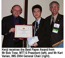 “Cool device, hot performance,” commended Mr Karl Varian, International Microwave Symposium (IMS) 2004 General Chair. Kenji’s research project “A Novel Amplifier Linearization Technique” stole the show by addressing the problem of distortion and short battery lifespan confronting 3G and 4G mobile communications developers. Kenji outperformed more than 290 participants from renowned American universities including the Georgia Institute of Technology, Stanford University, the University of California at San Diego and the University of Michigan; the UK's University of Leeds; and Australia's Macquarie University. He also received one of the six Fellowship Awards from the IEEE MTT-S this year.