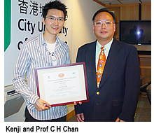 Kenji Yum received his first-class honours Bachelor of Engineering degree from CityU in 2002. Now an EE PhD student, Kenji is no stranger to international awards. He won Third Prize at the 2003 IMS in Philadelphia with his paper titled "Novel Sub-harmonically Pumped Mixers Incorporating Spiral Compact Microstrip Resonant Cells (CMRCs) for Low-cost Wireless Communications Subsystems". The same paper had also won him the Second Prize in the Undergraduate Section of the 2002 Institute of Electrical and Electronics Engineers (IEEE) Hong Kong Student Paper Contest, and the Championship in the IEE Hong Kong Young Members Section Paper Contest, 2002.