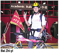 in February and cycled to Xiaman, Guangzhou, Shenzhen, and some other provinces in mainland China. Hong Kong is one of his stops, to raise public awareness of the increasing number AIDS contamination through blood donations. “To publicize AIDS prevention, primarily, is to save innocent lives; in the long run, it is to ensure that AIDS will not become a worse burden on our nation's developing economy. Every year, the Government spends huge amounts of money diagnosing AIDS patients,” Xiao Bai explained.