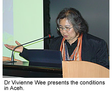 The forum began with an overview of the situation in Aceh presented by Dr Vivienne Wee, Associate Professor in the Department of Applied Social Studies and Associate Director of SEARC. Dr Wee covered the general conditions for the tsunami survivors, relief activities and the role of civic groups in Aceh. Ms Suraiya Kamaruzzaman, an Academic Visitor at SEARC, shared her personal experience of helping her relatives and friends in Aceh cope with the disaster.