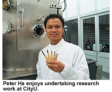 University of Sydney in 2002 and joined the joint PhD programme with CityU in 2004. His research explores “Diamond-like Carbon Coating on Cutting Tools” to extend the life of cutting tools through plasma immersion ion implantation. Peter recognises that the joint PhD programme is a stepping stone for his future career. “CityU has already forged close ties with many institutions in