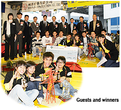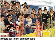 to simulate the power cables that would be carried by the arms of real transmission towers. In a real situation, if the arms of transmission towers fall off or the structure collapses, a power failure will occur.The model towers were put to the test on the special shaking table at CityU’s Heavy Structures Testing Laboratory. The 20-square-metre table, which is the largest of its kind among local universities, was made to generate a series of artificial earthquakes of gradually increasing intensity, and the model that stood intact the longest was proclaimed the winner.
