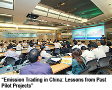 Three mainland environmental experts presented their perspectives on these issues. Professor Ma Xiaoling of the South China Institute of Environmental Sciences, State Environmental Protection Administration, looked at strengthening Guangdong - Hong Kong cross-border environmental governance in order to realize common objectives of clean air and blue skies in the Pearl River Delta region; Mr Xue Renjie, Deputy Director of the Jiangsu Environmental Protection Bureau, reviewed past emission trading schemes on the mainland; and Dr Zhu Fahua, Deputy President of the State Power Environmental Protection Research Institute, analyzed the prospects and challenges of a nation-wide emission trading programme from a corporate perspective.