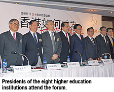 The participants at the forum included Professor Ng Ching-fai, President and Vice-Chancellor of Hong Kong Baptist University; Professor Lawrence Lau Juen-yee, Vice-Chancellor of the Chinese University of Hong Kong; Professor Tsui Lap-chee, Vice-Chancellor of the University of Hong Kong; Professor Edward Chen Kwan-yiu, President of Lingnan University; Professor John Leong Chi-yan, President of the Open University of Hong Kong; Professor Poon Chung-kwong, President of the Hong Kong Polytechnic University; and Professor Roland Chin Tai-hong, Acting President of the University of Science and Technology. |