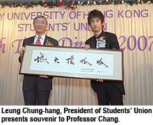 On behalf of the CityU student body, Leung Chung-hang, President of the CityU Students’ Union, presented Professor Chang with some Chinese calligraphy that read “CityU Number One!” (城大頂呱呱).