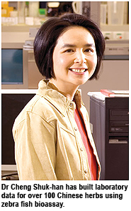 Zebra fish is an important model for studying the development of embryos and human diseases. This is because zebra fish embryos exhibit similar responses as mammalian models to pollutants and drugs for cardiovascular diseases, anti-angiogenesis and anti-cancer. Scientists use the fish as a bridge between the in vitro model and the in vivo model to save cost and time. So far component and safety checks have been performed for over 100 Chinese herbs.