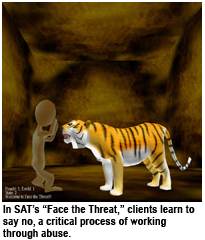 The Body Brush technology is a real-time body-driven system. Its computer motion analysis system uses infrared illumination and innovative graphic-rendering software that can translate body motion into 3D paintings. The technology offers participants new ways for making and sharing art in a virtual world. With the carefully designed interactive games and activities, SAT provides a new medium for expressing feelings. It is a unique process for accessing the internal world through kinesthetic movement, and it is a communication and emotional outlet for people recovering from physical and emotional abuse.