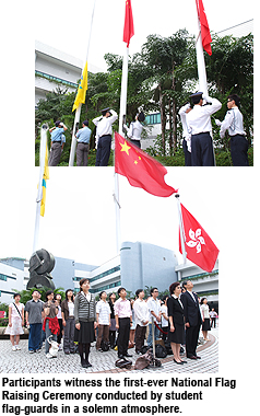 In a solemn atmosphere, colleagues and students gathered at the University Circle at 8:30 am to witness the student flag-guards raise the National Flag, the Regional Flag of the Hong Kong Special Administrative Region and the CityU Flag as the national anthem played.