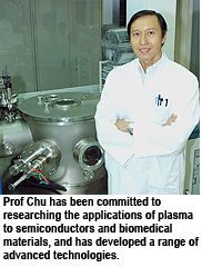 Under Professor Chu’s leadership, the CityU Plasma Laboratory has published more than 500 international papers and holds 11 patents in the mainland and the US. Plasma technology is used to improve the durability of satellite parts, reducing wear and tear, and produce the first silicon-on-insulator (SOI) wafers by plasma implantation. SOI increases the operational speed of computer notebooks and mobile telephones by up to 30%.