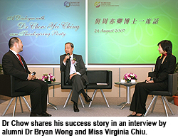 As a successful entrepreneur, Dr Chow considers integrity to be a highly important quality. This quality had enabled him to raise sufficient capital when he first started his business, said Dr Chow during an interview with CityU alumni Dr Bryan Wong Siu-fai and Miss Virginia Chiu Hsuang-kuen.