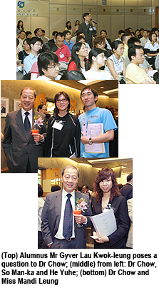 Mr Chung Shui-ming, Chairman of the University Council, said it was an honour for CityU students and staff to have the opportunity to share Dr Chow's valuable experience. "Dr Chow has been very supportive of the development of CityU, in particular our graduate studies. It is hoped that through today's sharing, students will learn to strive to do their best so they can contribute to the community and the country in the future," Mr Chung said.