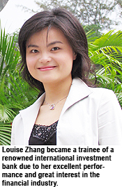 in the finance sector and her outstanding academic performance, Louise was selected from more than 1,000 applicants to become one of the three local trainees hired by a renowned international investment bank.Louise said the whole-person education at CityU allowed her to mature over the course of just three years. The exchange schemes broadened her vision and greatly enriched her educational and personal experience. She had also been a residence tutor and a Student Ambassador while studying at CityU. "As a residence tutor, I had the chance to deal with all age groups from different departments and to improve my communication skills. By organising the inter-hall activities, I obtained valuable experience in cooperating with others. As for being a Student Ambassador, I got to receive guests from different sectors and introduce them to CityU. This helped to improve my communication skills and assert my self-confidence," said Louise.