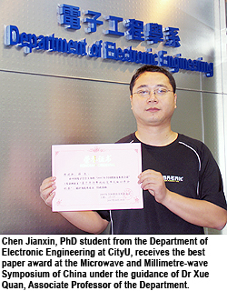 The biannual Microwave and Millimetre-wave Symposium of China is organised by the Microwave Sector of Chinese Institute of Electronics and has 20 years of history. It promotes technological developments within the microwave and millimetre-wave industry in China by providing exchange opportunities for scientists, research and development experts, scholars and students in the field. This year, the symposium received 560 papers and selected six best papers out of the 460 papers accepted. The paper from CityU’s representatives was the only awarded paper from Hong Kong.