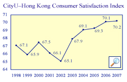 The index, an example of the University’s focus on applied research, uses a scale of 0 to 100 to represent ascending levels of consumer satisfaction. Its readings from 2002 to 2007 were 65.1, 67.9, 69.1, 69.3, 70.1 and 70.2 respectively, indicating a continuing upward trend.