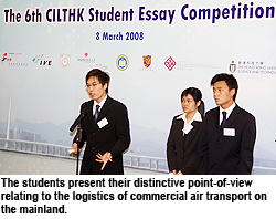 The five winning students from CityU were Tony Chan Hoi-hong, Lucy Cheng Lo-sai, Castle Ng Yu-hok, Ivan Wan Ying-wai and Timothy Wan Lap-tsun. Their distinctive points of view relating to over-capacity of air logistics on the mainland impressed the panel judges. In light of the increasing number of airports on the mainland and influx of overseas airliners, together with the rising global crude oil price and slow-down of exports worldwide, the team concluded the air logistics industry on the mainland was in need of reform. Among its many ideas, the team proposed borrowing from the European practice of expanding into more economical air transport routes. This could involve transferring excess cargo capacity to passenger transportation, demand of which was increasing on the mainland. They also proposed the integration of sea and air freight logistics and postponement of the building of new airports.