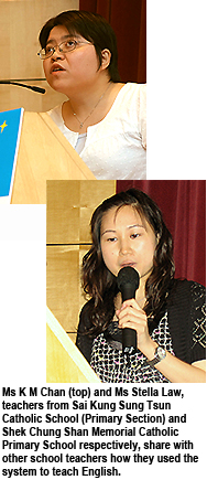 Ms K M Chan, a teacher from Sai Kung Sung Tsun Catholic School (Primary Section), said that students’ English standards had markedly improved after using the system. “At first students only wrote a sentence or two on the system’s bulletin board but later on they left more and more messages. Some of them even wrote an article to share comments with other classmates. This is very encouraging,” she said.Ms Stella Law Kong-fung, a teacher from Shek Chung Shan Memorial Catholic Primary School, said the school has been using the system for English teaching since 2006 and found that it enhanced students’ self-learning abilities and also assisted teaching. “We integrate the school-based curriculum into the system and it helps build a more systematic curriculum for us. Teachers can adjust the content according to each student’s ability and so teaching becomes more flexible,” she said.