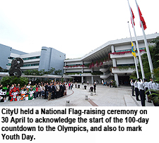 Colleagues and students gathered at University Circle at 8am to witness the ceremony. In a reverential atmosphere, the national flag, regional flag of the Hong Kong Special Administrative Region and CityU flag were raised to the accompaniment of the national anthem. Professor Richard Ho Yan-ki, CityU’s Acting President, Professor Paul Lam Kwan-sing, Acting Vice-President (Undergraduate Education), and Professor Lilian Vrijmoed Kwan Lee-ping, Dean of Student Learning, attended as guests. Olympic mascot and Fuwa added a dash of colour to proceedings.