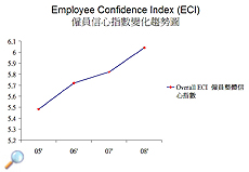The Employees Confidence Index (ECI) is measured on a scale of 0 to 10, representing ascending levels of confidence in terms of “Well-Being”, “Job Security”, “Job Prospects” and perceptions of the overall job market. Compared with last year, employees’ confidence had improved. The ECI mean increased by 0.22 to 6.04, suggesting Hong Kong workers had more confidence in their prospects of finding a better job. Employees in the Transport, Storage & Communication (5.28) and Construction (5.73) industries reported the lowest confidence levels, while those in Financing, Insurance, Real Estate & Business Services (6.38) reported the highest.