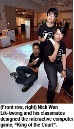 Nick Wan Lik-kwong, a Year 2 student of the programme, and his three classmates designed the interactive computer game, "King of the Court". A real-time object-tracking racing game, the playing field is projected onto the floor with players controlling virtual cars by remote control. Players and spectators alike can place obstacles in the way during the game to increase interactivity and levels of difficulty.