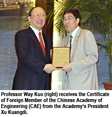 Professor Kuo is one of the three foreign members on CAE’s 2007 new members’ list. He received the highest academic title available in engineering science and technology in China from President Xu Kuangdi of CAE.
