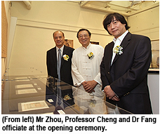 The opening ceremony of the exhibition was held on 11 July at CityU Gallery. Officiating guests include Mr Zhou Yi, Director of the Research Institute of Culture and History, The People's Government of Guangdong Province; Dr Alex Fang Chengyu, Assistant Professor of the Department of Chinese, Translation and Linguistics of CityU and collector of Chinese charms; and Professor Cheng Pei-kai, Director of the Chinese Civilisation Centre.