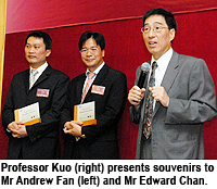 Professor Kuo presented souvenirs to two alumni, Mr Edward Chan Chi-kong and Mr Andrew Fan Ka-fai, for their years of generous financial support of the alma mater. As Staff Giving Club members and Alumni Ambassadors, they encouraged their fellow alumni to pride themselves as CityU graduates and support the “We Love CityU” Caring Card programme. Their plea received an overwhelming response from Shanghai alumni.