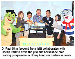 CityU began its collaboration with Ocean Park Conservation Foundation on the research and conservation of horseshoe crabs in 2006, including the collection of scientific data on the natural habitat of horseshoe crabs in Hong Kong. To save their natural habitat and that of other endangered species from further deterioration, the two organisations have strived to have horseshoe crabs listed as an endangered species in Hong Kong and to promote awareness of protecting their environment. They released 20 captive-bred horseshoes in Shui Hau, Lantau Island, in September 2008. Electronic chips were inserted in these crabs to track their growth and movements.