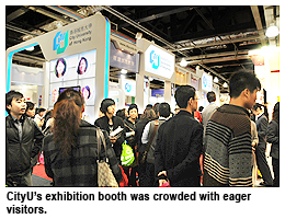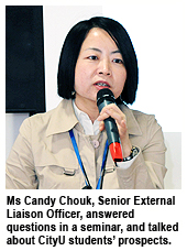 This year CityU bolstered its presence at the Shanghai exhibition. As many as 37 academic and administrative staff took part, including Professor Wei Kwok-kee, Dean of the College of Business, and Professor Johnny Chan Chung-leung, Dean of the School of Energy and Environment. In addition to having a booth in the exhibition hall, the University also held a number of seminars highlighting CityU’s strengths and explaining the courses offered. On the first day of the exhibition, three seminars on CityU’s academic programmes and research work were hosted respectively by Dr Rodney Jones, Associate Head of the Department of English, Professor Eden Yu Siu-hung, Associate Dean of the College of Business, and Professor Johnny Chan Chung-leung.For his seminar, Dr Jones asked Dr Jackie Lou Jia, who recently joined his department as Assistant Professor, to serve as interpreter. Dr Lou came to Hong Kong from Shanghai after completing her middle school education. She received her bachelor degree from CityU, and was then admitted to Georgetown University, Washington, DC, for further studies. Happy to be back at CityU, Dr Lou was eager to share her study experience with middle school students in mainland China and explain to them how CityU had helped her open the door to the world.