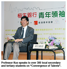 “It’s hard to be an all-time winner. To maintain Hong Kong’s uniqueness and competitiveness, we must invest in scientific research and encourage creativity,” said Professor Way Kuo, President of City University of Hong Kong (CityU), at a forum organised by the Hong Kong Federation of Youth Groups on 11 May. In his talk titled “Convergence of Talents” for the Young Leadership Workshop 2010, Professor Kuo explained to over 300 secondary and tertiary students the importance of creativity and research for nurturing future talents of Hong Kong.