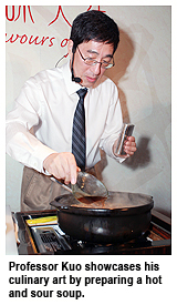 Before the event began, Professor Kuo showcased his culinary skills by preparing a hot and sour soup. He said he developed his interest in cooking at a very young age. As a child, he liked to go to the market with his mother, and still likes to shop for food when he has time.