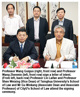 Professor Wang Guiguo, Dean of CityU’s School of Law, and Professor Wang Zhenmin, Dean of Tsinghua University’s School of Law, signed the letter of intent on 17 September 2010. “The letter of intent marks a milestone between the law schools at CityU and Tsinghua University. It will further enhance academic exchanges between faculty members and students at both universities,” Professor Wang Guiguo said.