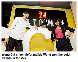 Ms Wong Yee-mei, a 2010 SCM graduate, won the Gold Award in the open category with the short film This Pair, and Wong Chi-chuen, a Year 3 SCM student, won the Gold Award in the interactive media category with the multi-media installation 10Hz.