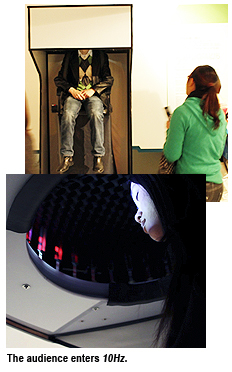 The multi-media installation 10Hz stimulates the audience with sight and sound. After the audience enters the installation, more than two dozen vibrating tuning forks and other sights and sound generate a series of illusions.