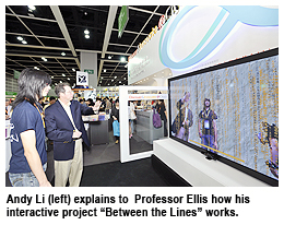 In addition, Andy Li Wing-ho, a PhD student from the School of Creative Media, enriched the exhibition with his interactive kinesthetic project, “Between the Lines”. Visitors could stand in front of a 103-inch plasma screen and make quotes taken from Chinese classics ring like the sound of a bell and turn golden simply by waving their arms.