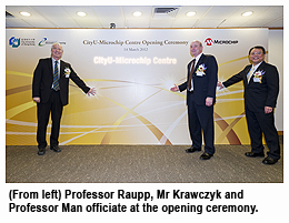 A ceremony held on 14 March marked the official opening of the Centre. It was officiated by Mr Joe Krawczyk, Vice President, Asia Pacific Sales, Microchip Technology Inc., Professor Gregory Raupp, Vice-President (Research and Technology), CityU, and Professor Man Kim-fung, Head of the Department of Electronic Engineering, CityU.