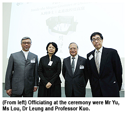 Mr Gabriel Yu Chi-ming, Project Donor and Chairman of the Executive Committee of the Friends of Dunhuang Hong Kong; Ms Lou Jie, Research Fellow and Director of the Fine Art Department Exhibition Center of Dunhuang Academy; Dr Norman Leung Nai-pang, Pro-Chancellor of CityU; and Professor Way Kuo, President of CityU, officiated at the opening, which took place at the Run Run Shaw Creative Media Centre, CityU.