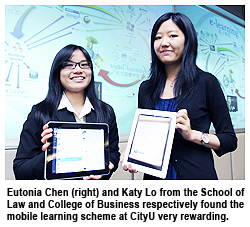 CityU’s first mobile learning pilot scheme, launched in March 2011, lets students borrow from a stock of 400 iPads and iPod Touch devices. Under the support of Professor Wang Guiguo, Dean of the School of Law (SLW), a school-wide mobile learning project in October 2011 began subsidising iPads for all law students. Roughly a thousand iPads were deployed.