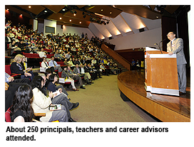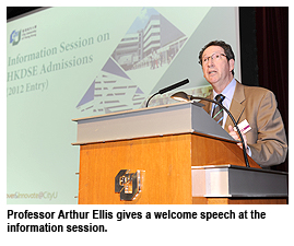Professor Paul Lam Kwan-sing, Vice-President (Student Affairs), briefed participants on the pre-requisites that students taking the 2012 HKDSE need when applying for CityU programmes. He also discussed the College-based admissions system newly adopted by CityU, the admission requirements of each college, and details of the interview arrangements. In addition to the basic entrance requirements, some colleges may have additional requirements such as a minimum grade for certain subjects in the HKDSE or different weightings on specific subjects, he explained.