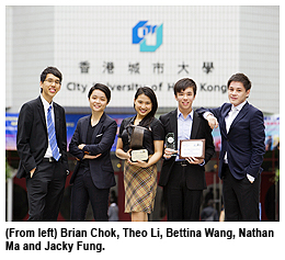 The CityU team comprised Nathan Ma Hin-che (Year 2, LLB), Jacky Fung Wai-nam (Year 2, LLB), Bettina Wang Zhenyuan (Year 2, LLB), Brian Chok Man-ho (Year 3, LLB) and Theo Li Jiani (Year 3, JD) under the guidance of Dr Mark Kielsgard, Assistant Professor of SLW.