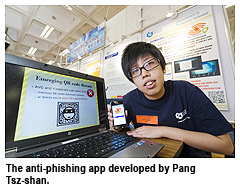 Another item, developed by Katie Pang Tsz-shan, a student from the Department of Computer Science, helps to protect smart phones against phishing with an app called “SiteWatcher on Android”, deploying the anti-phishing service of the SiteWatcher server provided by CityU.
